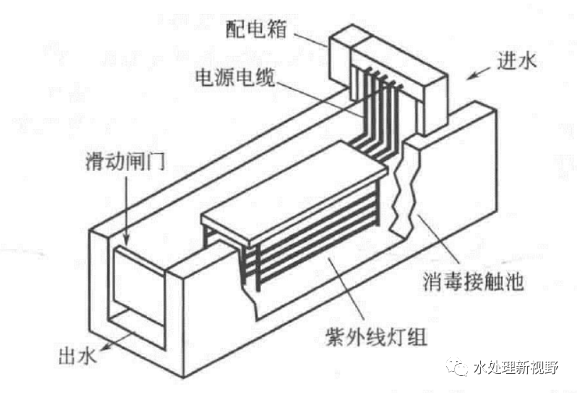 水在重力作用下流經(jīng)紫外線消毒器,敞開(kāi)式系統(tǒng)又可分為