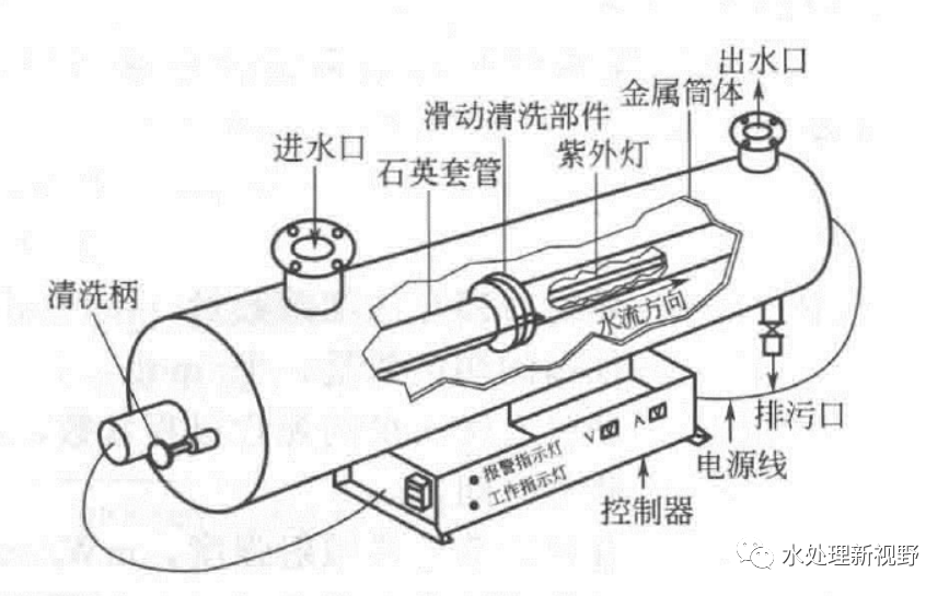 屬承壓型,用金屬簡(jiǎn)體和帶石英套管的紫外線燈把被消毒的水封閉起來(lái),結(jié)構(gòu)形式如下圖所示: