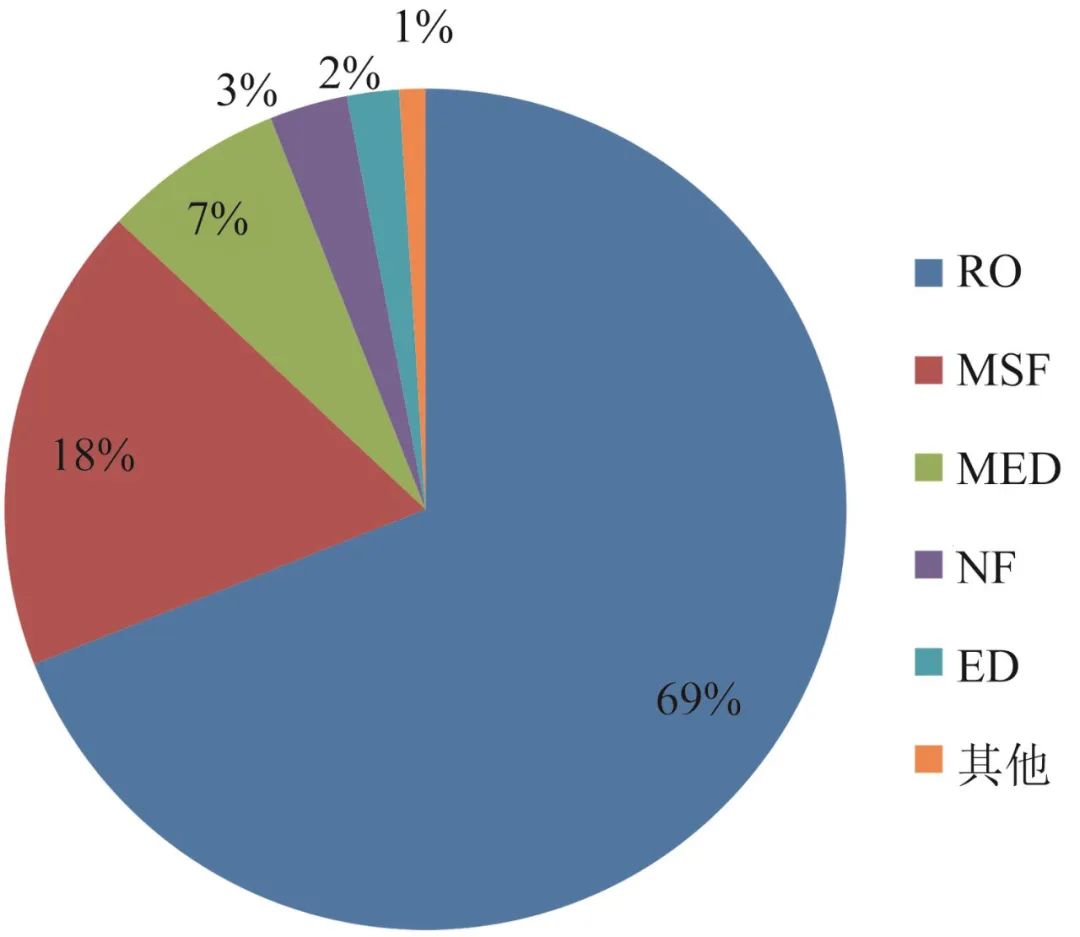 RO、MSF、MED 3種技術(shù)占全球海水淡化總產(chǎn)能的94%,其中RO技術(shù)占69%,應(yīng)用最為普遍。