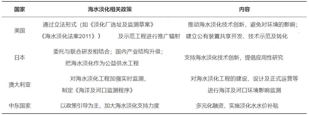 美國、日本、澳大利亞、以色列等海水利用產(chǎn)業(yè)較發(fā)達(dá)的國家均制定了相關(guān)政策及執(zhí)行措施,在海水利用產(chǎn)業(yè)上給予支持引導(dǎo),確保其健康發(fā)展。表1為國外部分國家海水淡化相關(guān)政策,對我國海水淡化發(fā)展也有重要啟示。