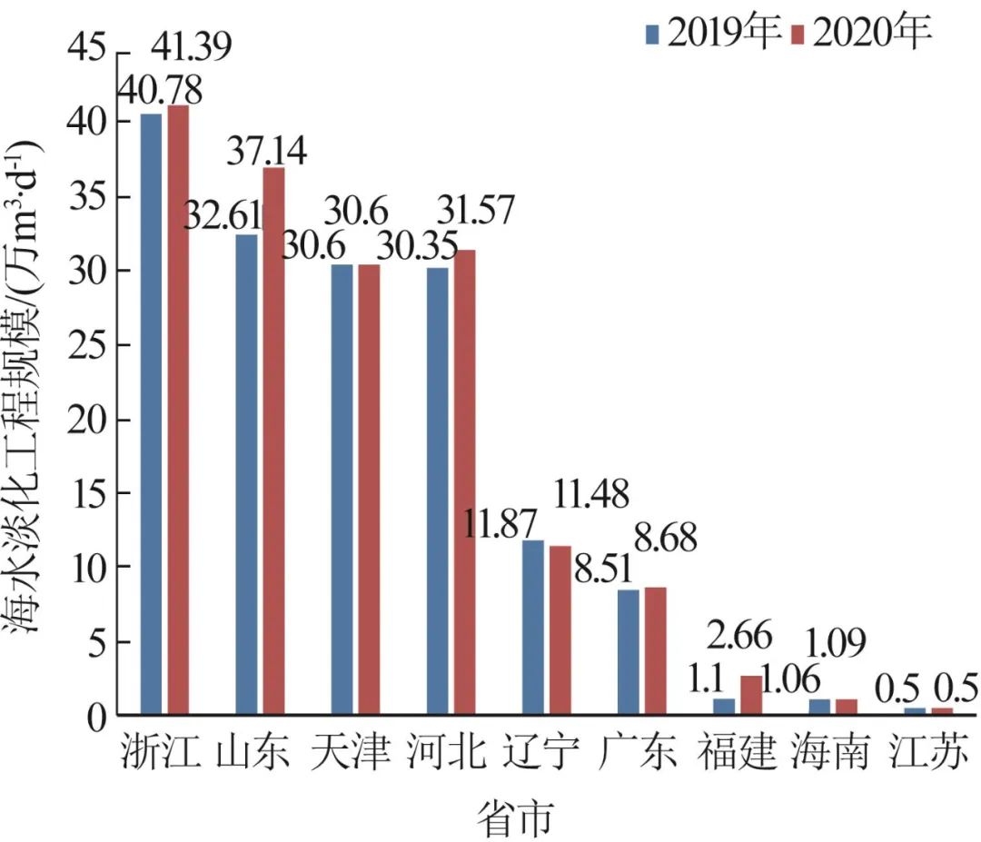 浙江省的海水淡化工程規(guī)模40.78萬m3/d,較2018年的23.23萬m3/d漲幅75.5%,2019年發(fā)展尤為突出。同年,天津海水淡化工程規(guī)模為30.60萬m3/d,河北海水淡化工程規(guī)模為30.35萬m3/d,京津冀地區(qū)不僅是我國海水淡化技術(shù)應(yīng)用與發(fā)展的先進(jìn)區(qū)域之一,也是該領(lǐng)域創(chuàng)新驅(qū)動發(fā)展最集中的地區(qū)之一。