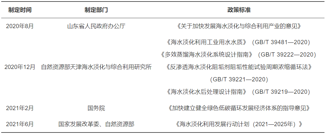 表2 2020年以來我國海水淡化相關(guān)政策和標(biāo)準(zhǔn)